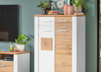 Stauraumelement. Front und Korpus in Weiß supermatt MDF. Absetzung Eiche Altholz Nachbildung und Hirnholz Nachbildung. Griffe Kunststoff silber matt. Mit 2 Holztüren und 2 Schubkästen. Inklusive Softclose und Türstopper. Exklusive Dekoration.